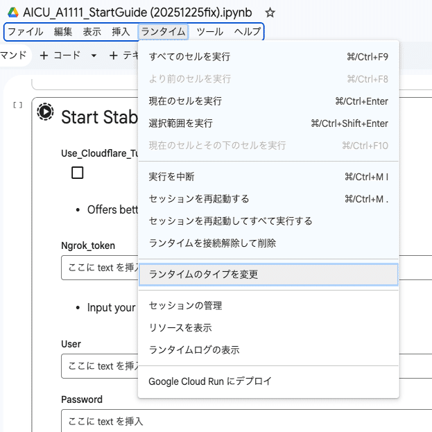 まずこの手の問題が起きた時に、試してみてほしい手法は「ランタイムバージョンの変更」です。Colabメニューの「ランタイム」→「ランタイムのタイプを変更」から「ランタイムバージョン」を「2025.7」など過去の環境にすることで、動作する可能性があります。