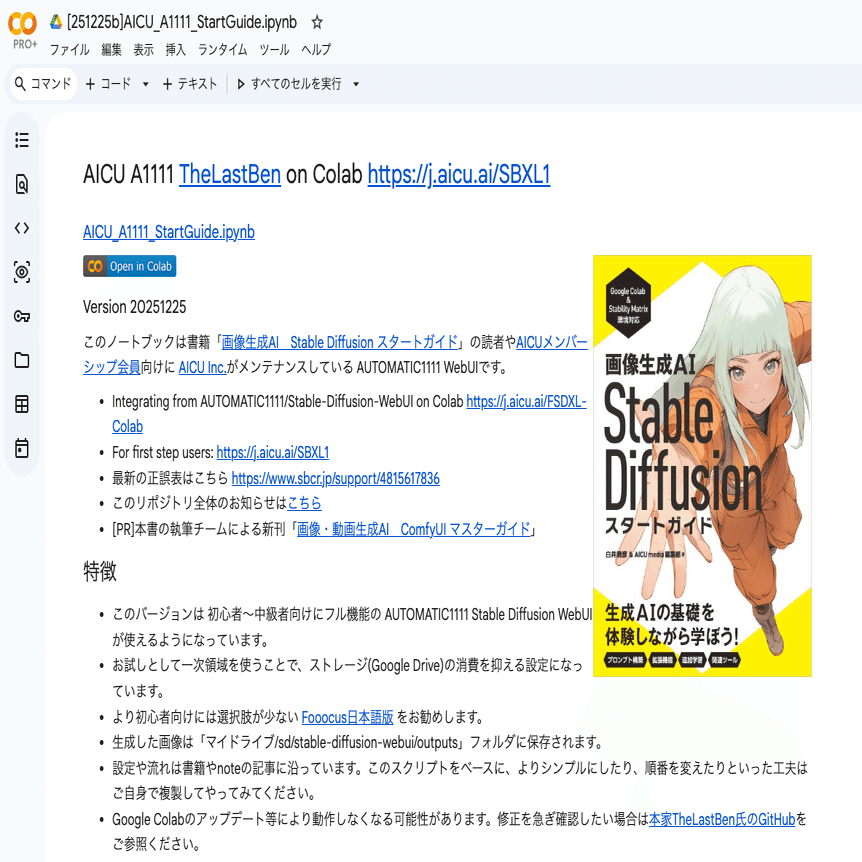 「SD黄色本」として親しまれている書籍「画像生成AI Stable Diffusion スタートガイド」に付属のAUTOMATIC1111(A1111)が動作しない状況がありましたので修正報告です。原因として、2025.10からGoogle ColabがPython 3.12に更新されました。