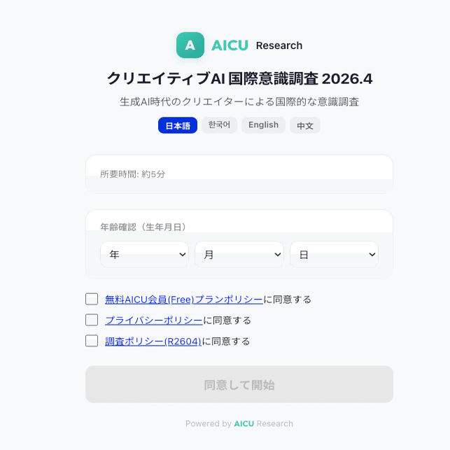 이번에 저희 AICU에서는 전 세계 크리에이터와 AI 사용자들의 인식 및 활용 실태를 파악하기 위해 **「크리에이티브 AI 국제 의식조사 2026.4(R2604)」**를 실시합니다.