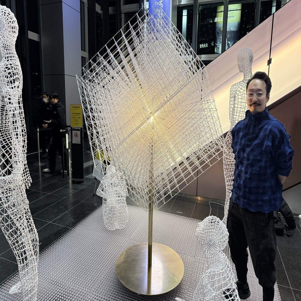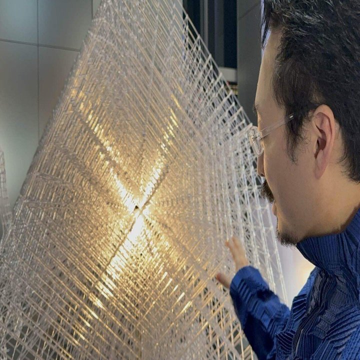 コアに向かってギュギュギュッと収束していく四角錐の集合体。どこから見ても真ん中に行くような形状。直接光も入るし、屈折光も美しい。「ピラミッドを底面から見たような感じ、あるいはピラミッドを6面から押さえているような」と氏が説明するその複雑な格子を光が通り抜けるとき、計算された「屈折」が宝石のような輝きを生みます。物理的な光と出会って初めて完成する美しさ。加藤氏は、本来は見えないはずの「光の道筋」を、触って動かせる樹脂のフレームによって可視化してみせたのです。