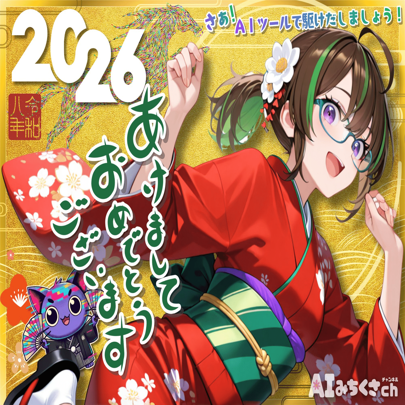 ComfyJapanのコミュニティ運営などでも多大な協力をいただいている、VTuber・AI解説者の「AIみちくさチャンネル」道草ざすこさんより、2026年の幕開けを彩る鮮やかな年賀状が届きました。「さあ!AIツールで駆けだしましょう!」という力強いメッセージと共に、デジタルと和が融合したエネルギッシュな一枚!