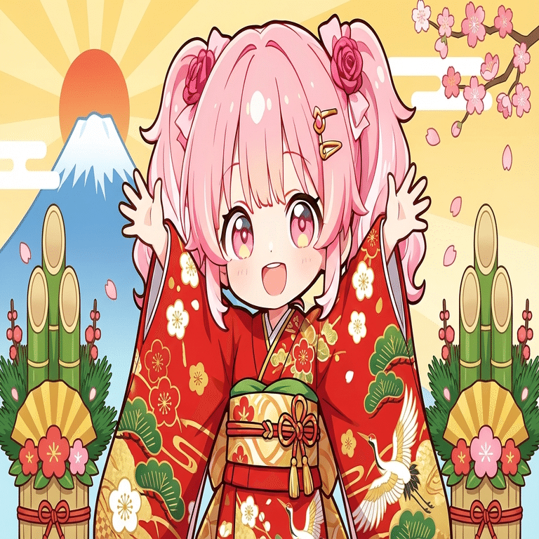 着物の袖を翻して、こちらに手を差し伸べているような構図。 静止画なのに、今にも動き出しそうなエネルギーを感じるわ。彼女の眼鏡の奥の瞳、キラキラしていて、新しい年への期待に満ちている。「AI解説」という難しいジャンルを、こうやってポップに、華やかに見せる表現力……クリエイターとして参考になるわね。