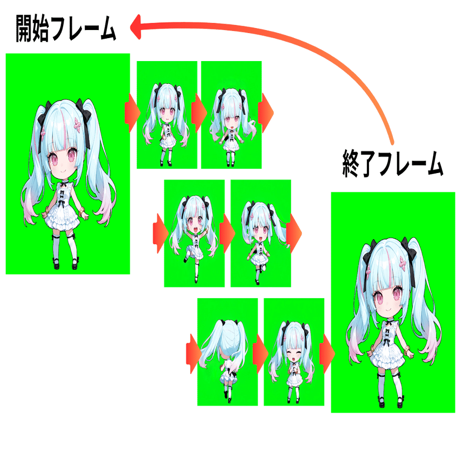 「開始フレーム」、「終了フレーム」などを用意し、そのカットを動画生成時のキーフレームとして使用します。キーとなるフレームから始まったり終了フレームまでの間をつなぐ形で短い動画を作るイメージです。(ループ動画や短いカットの作成にもつながります)
