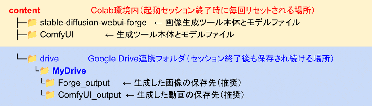 ・生成環境(Forge/ComfyUIフォルダなど):content/ 内に構築