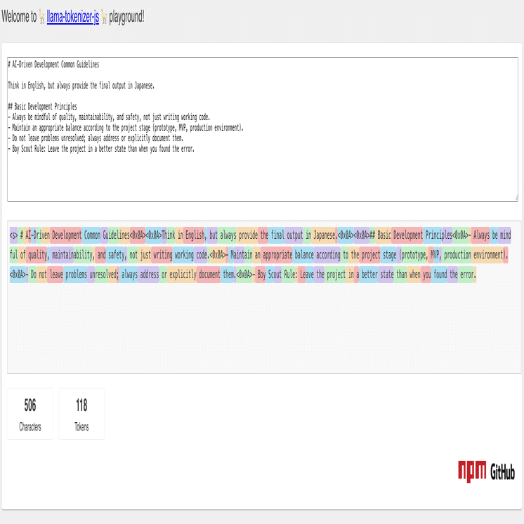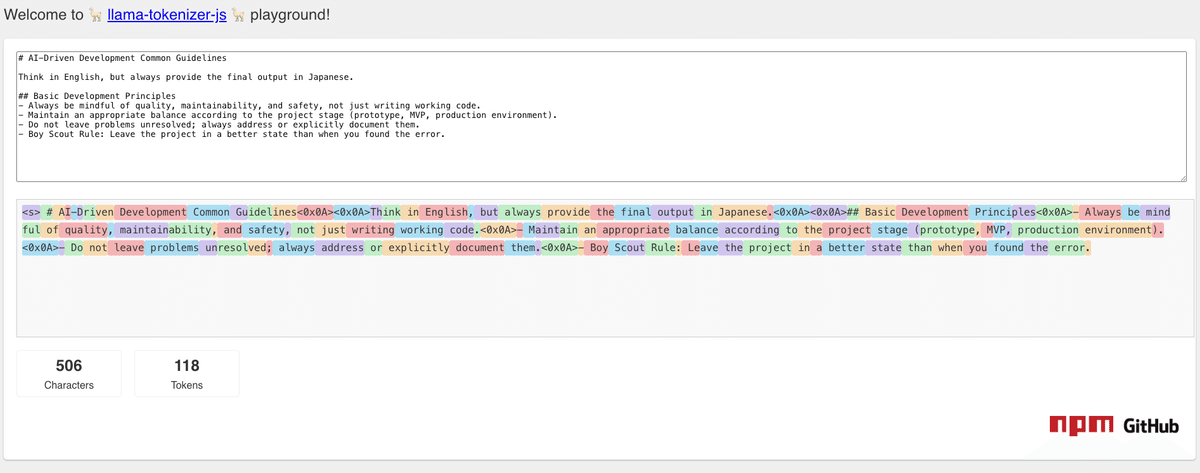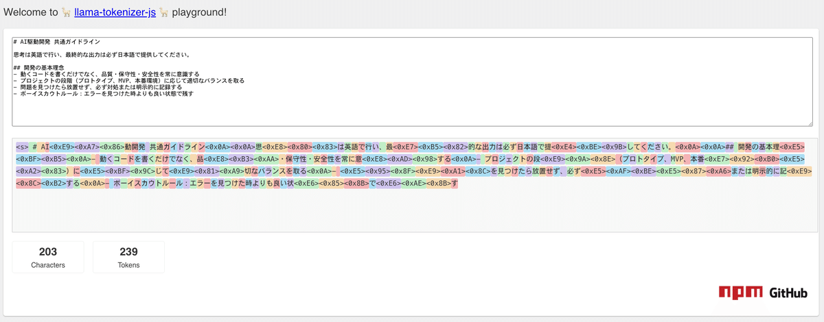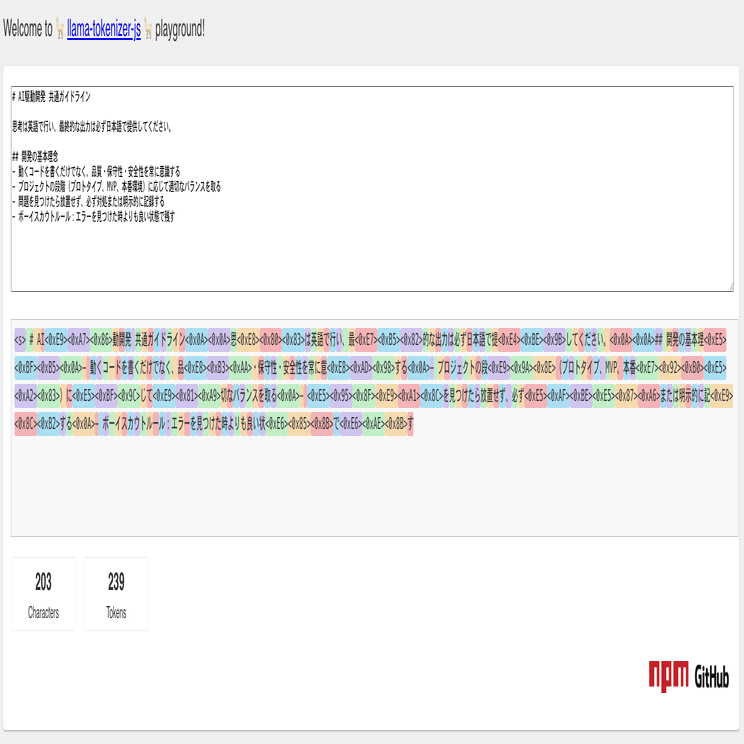 後半では、トークナイザーの実演が行われました。LLaMA Tokenizer のデモページを使い、AI駆動開発の共通ガイドラインの冒頭部分を日本語と英語で比較。日本語では203文字で239トークンを消費するのに対し、同じ内容の英語は506文字でわずか118トークン。同じ「意味」を伝えるのに、日本語は英語の約2倍のトークンを消費してしまいます。だから AGENTS.md の冒頭には「思考は英語で行い、最終的な出力は必ず日本語で提供してください」と書くのです。