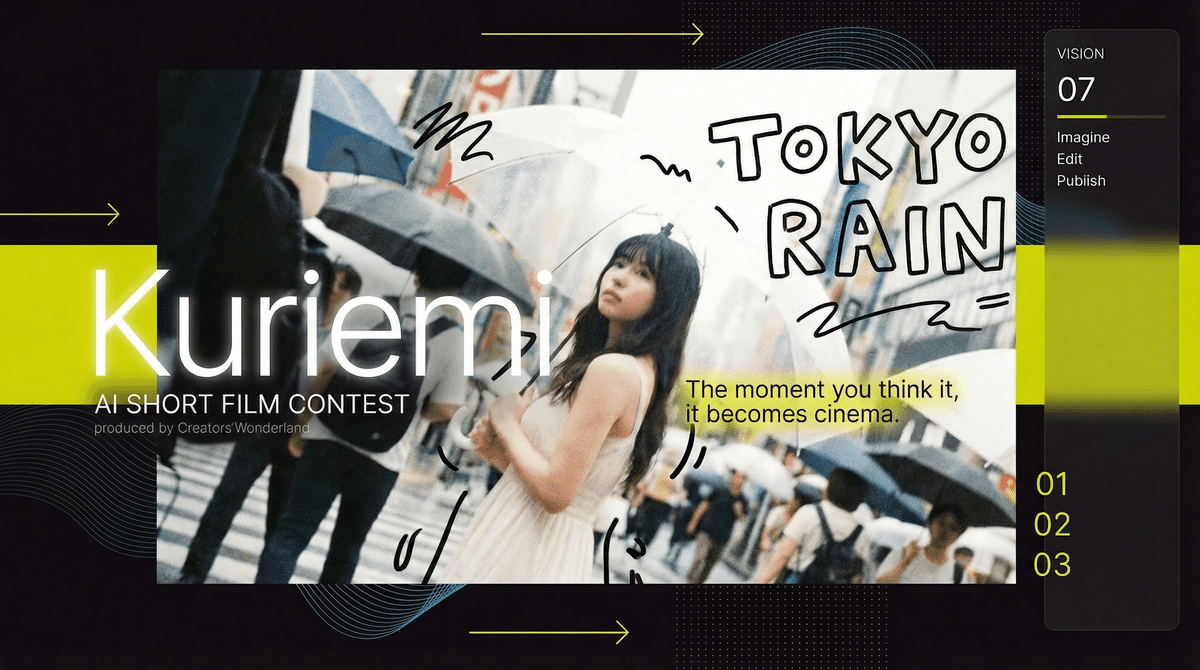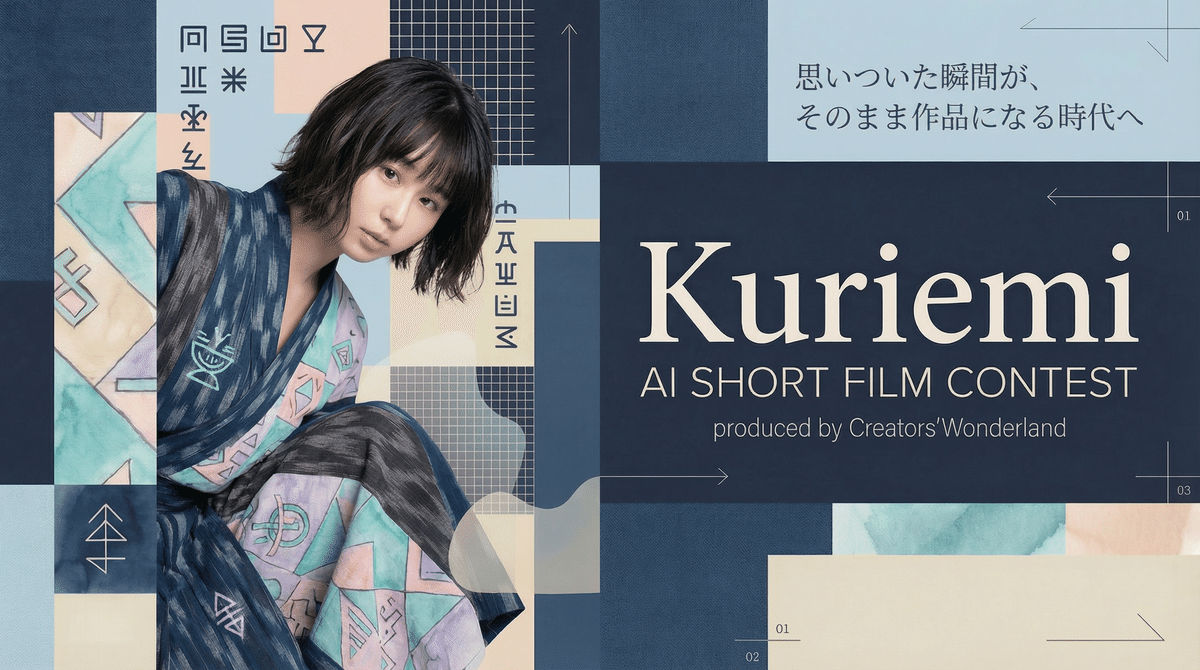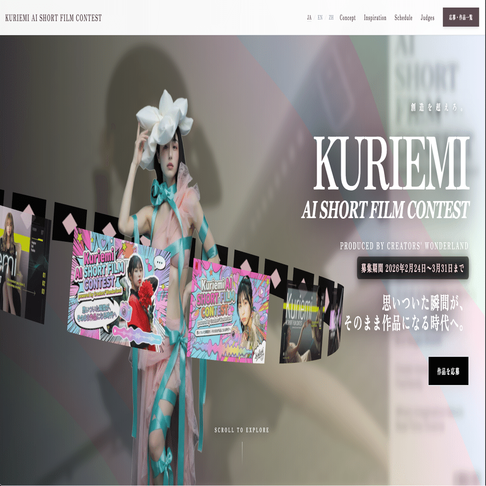 Creators' Wonderland Awards 第1弾。AiHUB CMO・タレント「くりえみ」の公式素材を公開し、生成AIを活用したオリジナル映像作品を募集するクリエイティブアワード。昨年 Sora キャスト機能で5,000本超のAI動画が世界中から投稿された熱狂を、公式IPとクリエイターの健全な共創へ。