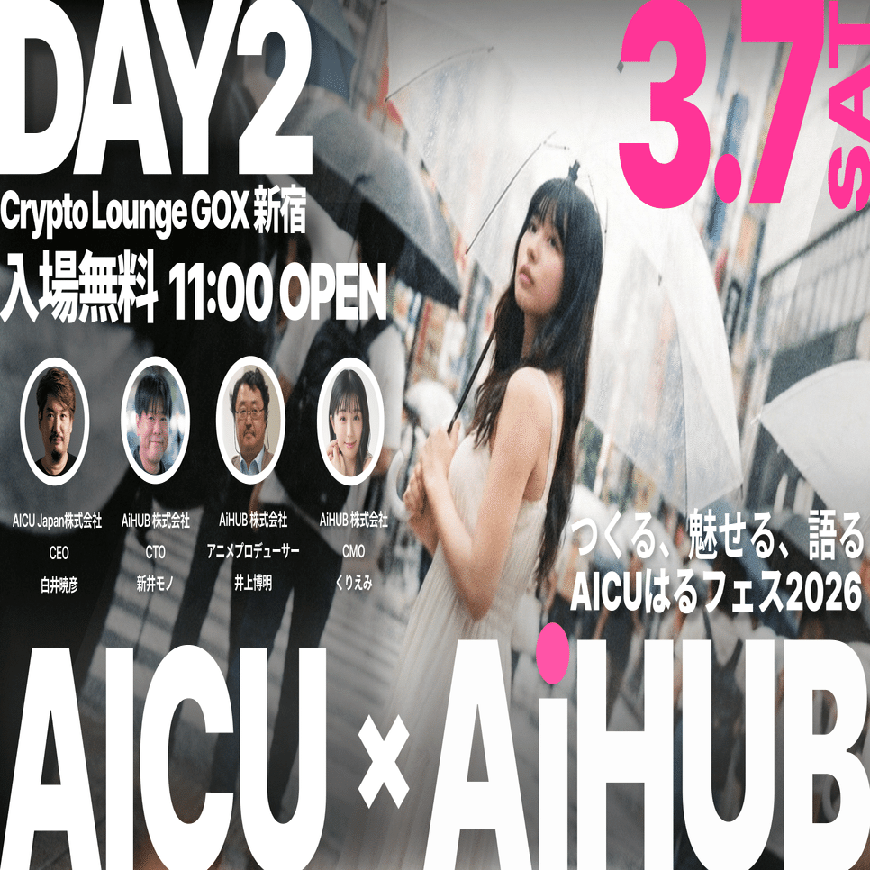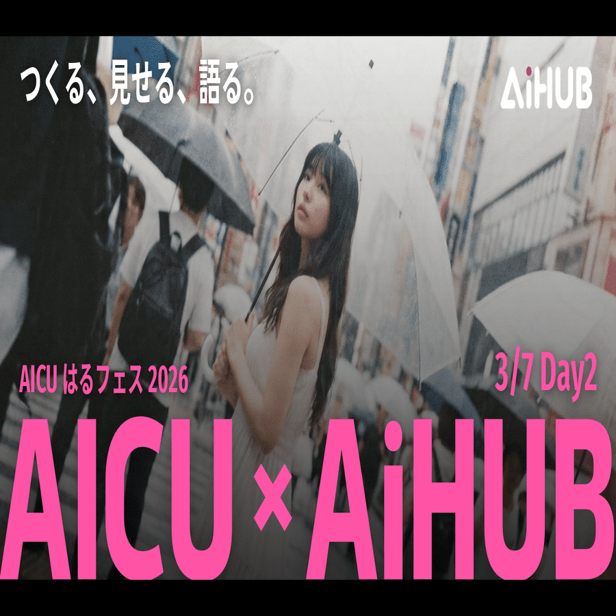 最先端の画像・動画生成AI技術が集結する国内最大級のクリエイティブAIイベント「AICUはるフェス@GOX2026」のメインイベントDay2「AICU × AiHUB Day」が、2026年3月7日(土)に新宿GOXにて開催されます。本イベントは日本の生成AIクリエイティブ業界で長年活動を続けてきた生成AIクリエイティブのメインプレイヤーである「AICUとAiHUB」が、最新の成果発表や未来展望を語ります。