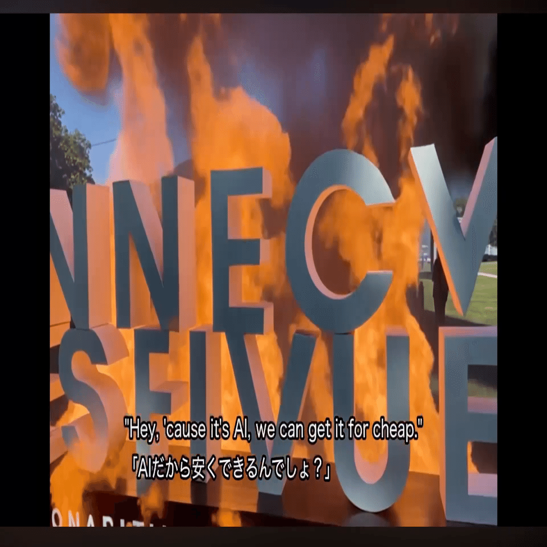 この作品の原点は、夏のフランスで目の当たりにしたという反AIデモの強烈な体験。「撮りたかったけど撮れなかった光景」をAIで再現し、現地のリアルな熱気やクリエイターたちの主張を映像に焼き付けました。