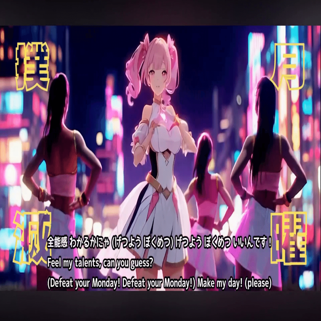 最後は、一度聴いたら忘れられないキャッチーな楽曲と、目まぐるしく展開する映像が魅力的な ないとっちさんの作品「月曜撲滅委員会」。先月のコンテスト作品です。Stable Diffusionでキャラクターを生成し、背景はMidjourneyで、というように複数のツールを巧みに使い分け、ポップでエネルギッシュな世界観を構築。