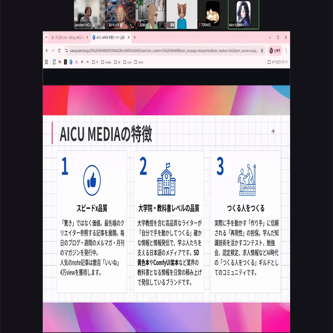 クリエイター支援: 「つくる人をつくる」をビジョンに掲げ、国内外の生成AIクリエイターが集う交流の場の提供や、共同制作の機会創出を目指しています。