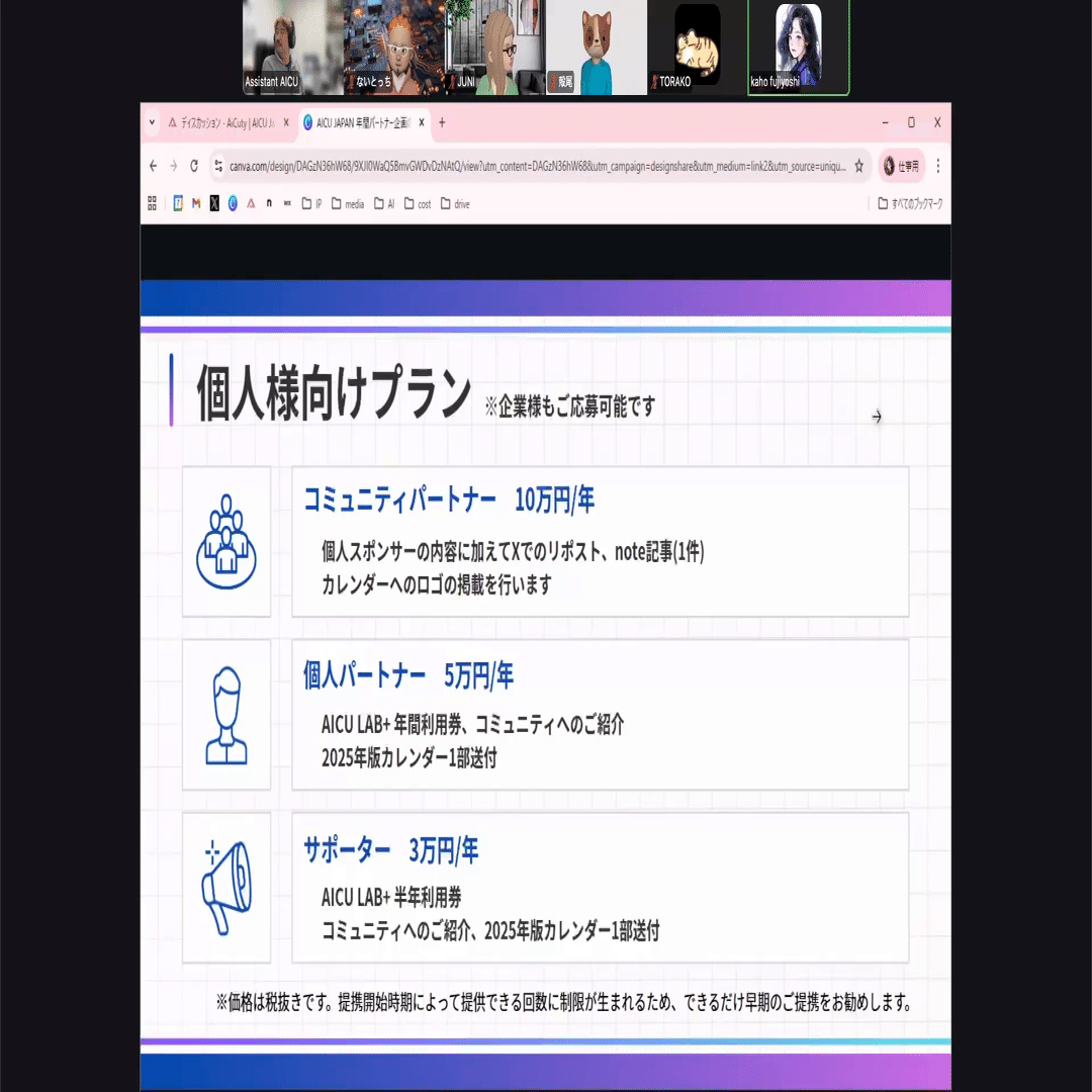 ライブ配信で言及された「サポーター個人パートナー」は、個人向けの年間プランとして設計されており、AICUの活動をより深く応援したいクリエイターやファンに向けた特別な内容となっています。