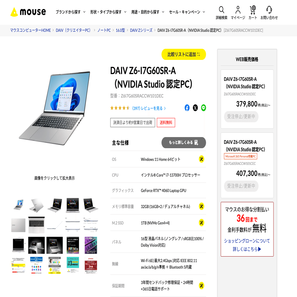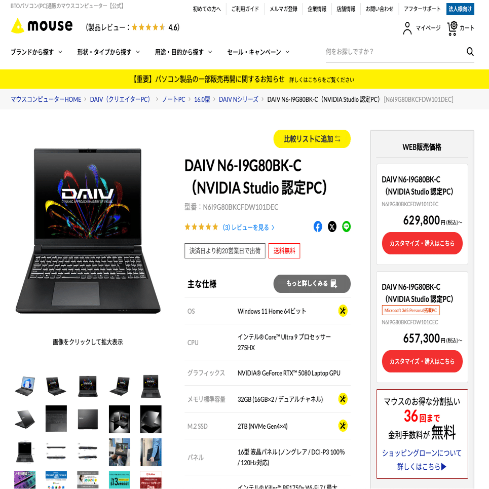 DAIV N6-I9G80BK-C (Core Ultra 9/GPU GeForce RTX 5080 Laptop GPU/VRAM=16GB) 「529,800円〜」(当時)が 「629,800円(税込)~」になってるよ!“竹コース”「DAIV Z6-I7G60SR-A」(Core i7-13700H/GeForce RTX 4060 Laptop GPU, VRAM=8GB) の約28万円(当時)が「379,800円(税込)~」とそれぞれ10万円近く値上がりしてる!