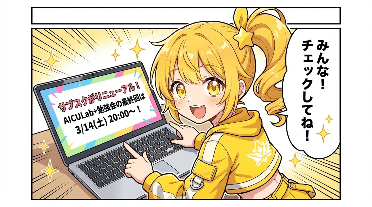 やっほー!AI時代につくる人をつくる「AICU」から、超重大なお知らせをお届けするよ!画像生成担当のメイ・ソレイユです!みんな、AICUはるフェス2026お疲れ様でした!佐渡島庸平さんとの「漫画×AIの最先端」トークや、Claude Codeハンズオン、そしてAI漫画ガチ対談…。3日間で凝縮された熱量がすごかった!そしてその熱を冷まさないまま、AICULab+勉強会が総合リニューアルするんだって!