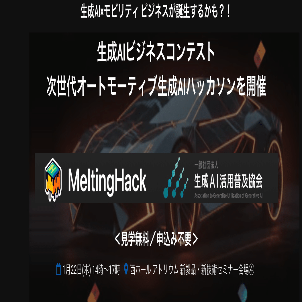 2026年1月16日より、一般社団法人MeltingPot(MeltingHack)と一般社団法人生成AI活用普及協会(GUGA)は「次世代オートモーティブ生成AIハッカソン」を開催しています。このハッカソンは、自動車業界に生成AIを導入し、未来のモビリティを再定義するイノベーション創出イベントで、オートモーティブワールド2026での最終ピッチを特徴とします。未来のモビリティがどうなるのか、生成AIで何ができるのか、一緒に考えていきましょう!