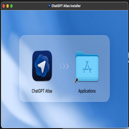 Applicationsフォルダの中にある ChatGPT Atlasをダブルクリックするとインストーラーが起動します。以下はインストーラーのセットアップ過程です。非常に雰囲気がいいインストーラーですが、セキュリティ関係などの検証のために、丁寧に確認しながら進めることをお勧めします。