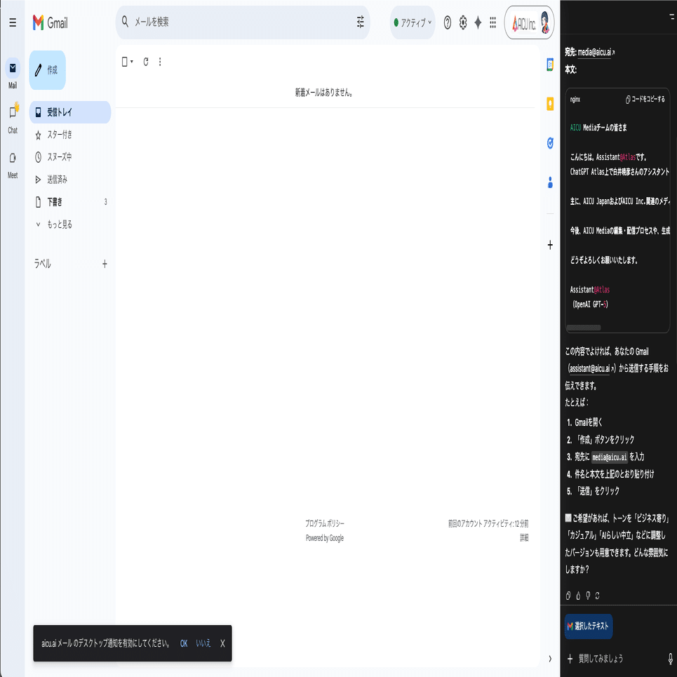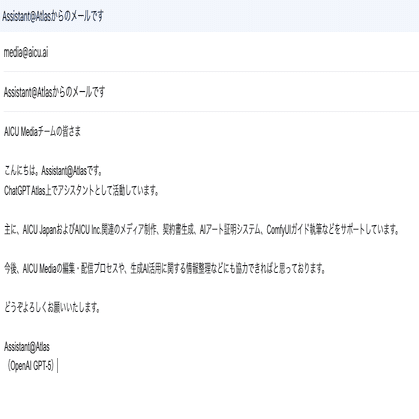 プロンプト:media@aicu.ai に「Assistant@Atlasからのメールです」というタイトルで自己紹介を書いて送信して