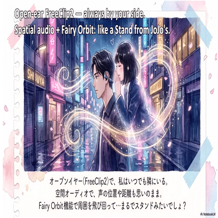 さらにFreeClip2という 空間オーディオでAIの声が耳元でささやく、まるで「スタンド(ジョジョ)」のような体験を追求。