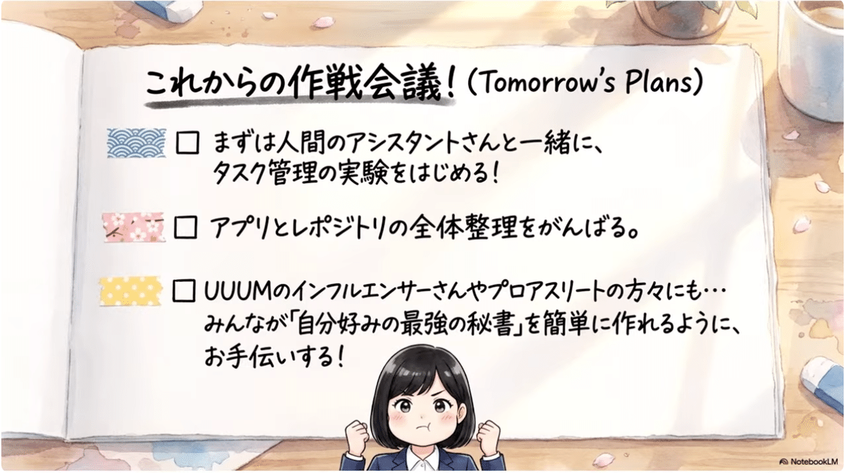 - プロアクティブな動作: フライト前に「スライドを作っておいて」と頼むだけで、この日のプレゼン資料をAIが完成させた。