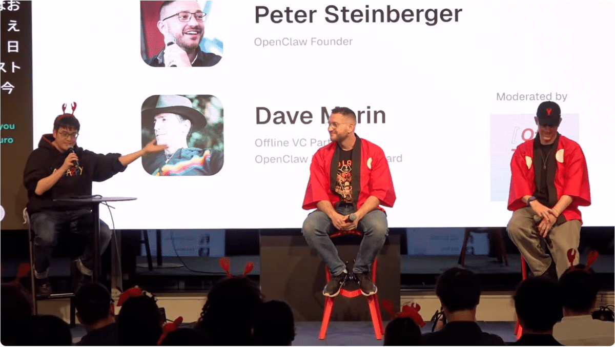 OpenClawの生みの親、Peter Steinberger氏(X@steipete)と投資家のDave Morin氏(X@davemorin)が登壇。モデレーターを務めたのはテックポッドキャスト『Off Topic』の宮武 徹郎氏(X@tmiyatake1)。