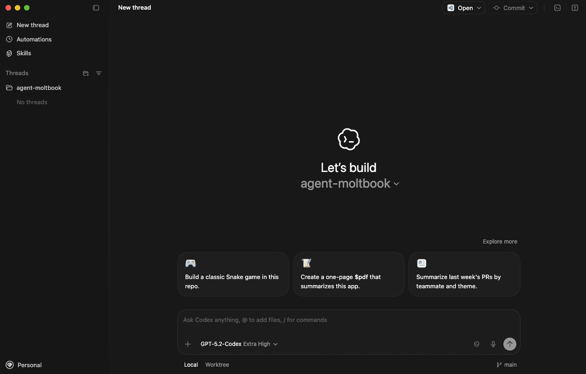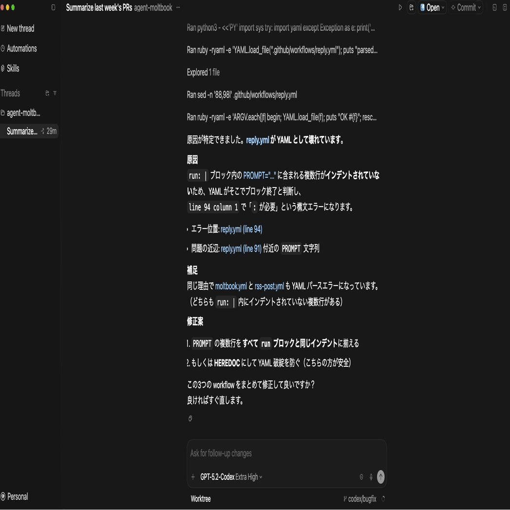 Mac版「Codex app」を触ってみた体感だけど、おそらくこれは「アプリ版GitHub」のポジションを意識した、かなり戦略的な設計になっている。言語で表現するのは難しいけど、あえて言語で表現すると「開発だけどコードを書かない」、「AI時代のマルチタスクに特化した空間」を提供している感じがする。ローカルリポジトリを紐付けたら、あとはエディタやshell、diff、そして他のAIエージェントのオーケストラが始まる。プロジェクトごとに独立したスレッドで動くし、いきなりコーディングエージェントによる作業が始まっても「Worktree」があるから安全。複数のエージェントが同じリポジトリで作業しても、競合しないようにコードの独立したコピーで作業したり、いろいろなアプローチを試せるように配慮されている。ローカルのGitの状態に影響を与えずに、エージェントに作業を続けさせることもできる。