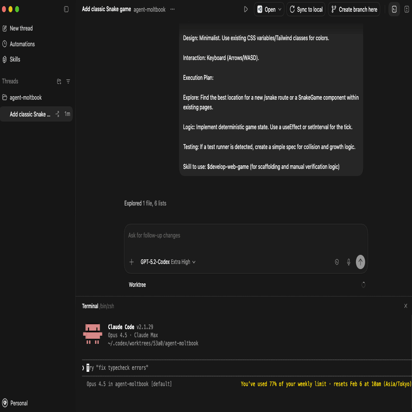 右上のほうにdiff、ブランチ管理、そして上にCodeやFinderといった各種アプリとの連携がある。左のスレッドはチャットのスレッドに見えるけど、実際にはリポジトリの管理とSkillと自動化が融合している。そして、下にはコンソールがいる(右上のToglle Terminalから起動)。つまり、Codex.appからClaude Codeを呼び出すことができるってことだ。