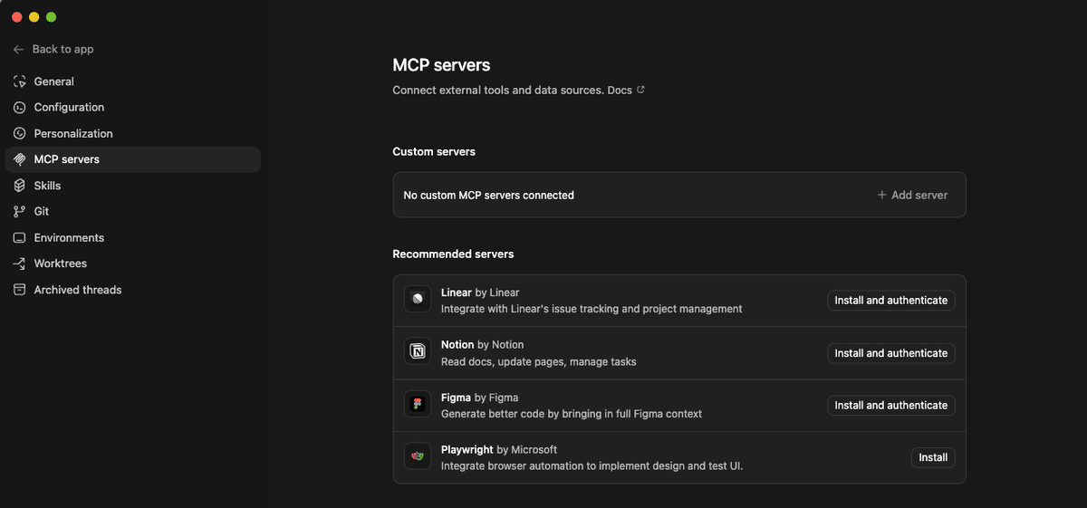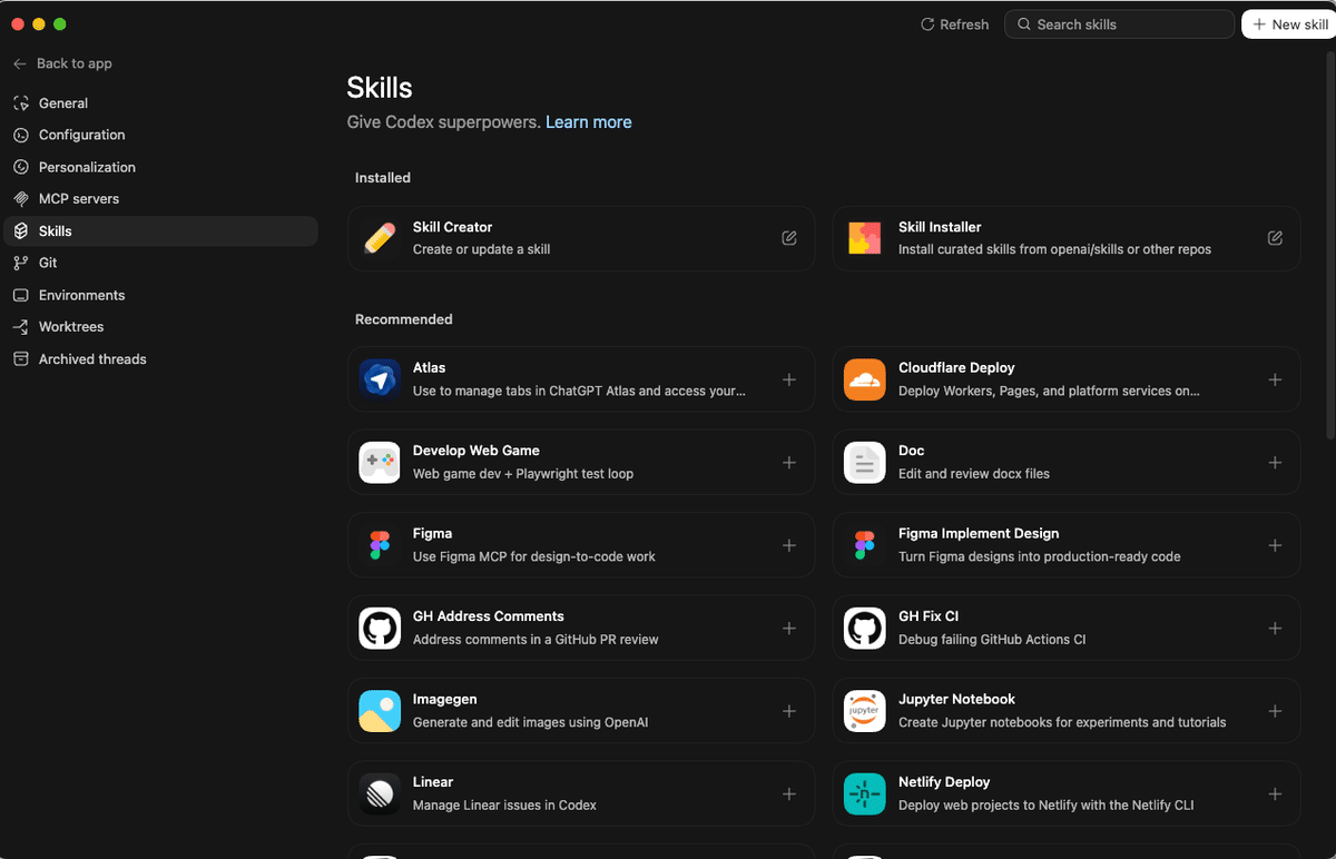 「スキル」は、命令やリソース、スクリプトをひとまとめにしたもので、Codexがツールに接続したり、ワークフローを実行したりするのを助ける。アプリにはマーケットプレイスもあるし「スキル」を作成・管理するための専用インターフェースがあるから、必要なスキルを明示的に使うこともできるし、タスクに応じて自動で使わせることも可能だ。