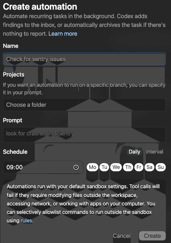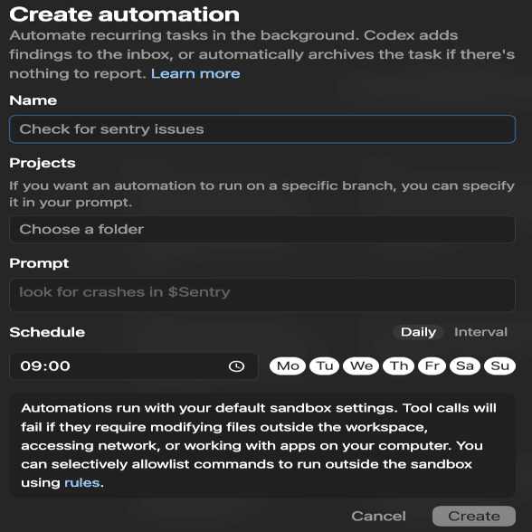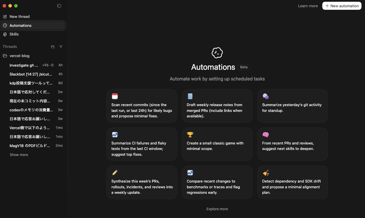 Codex appでは、「オートメーション」を設定して、Codexにバックグラウンドで自動的に作業させることができる。指示とスキルを組み合わせ、設定したスケジュールで実行させるんだ。完了したらレビューキューに結果が届くから、必要ならそこで続きの作業を再開できる。