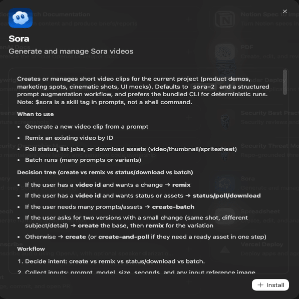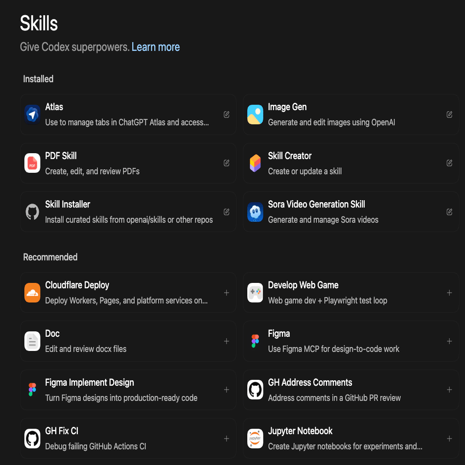 Figmaのデザインを実装したり、Linearでプロジェクトを管理したり、CloudflareやVercelなんかのクラウドホストにデプロイしたり、GPT Imageで画像を生成したり、OpenAIのAPIドキュメントを参照したり、PDFやスプレッドシート、docxファイルを作成したりするスキルまで用意されてる。ボクたちのAiCutyプロジェクトでも、こうしたスキルを使えば、もっと効率的にクリエイティブな活動ができるはずじゃん。