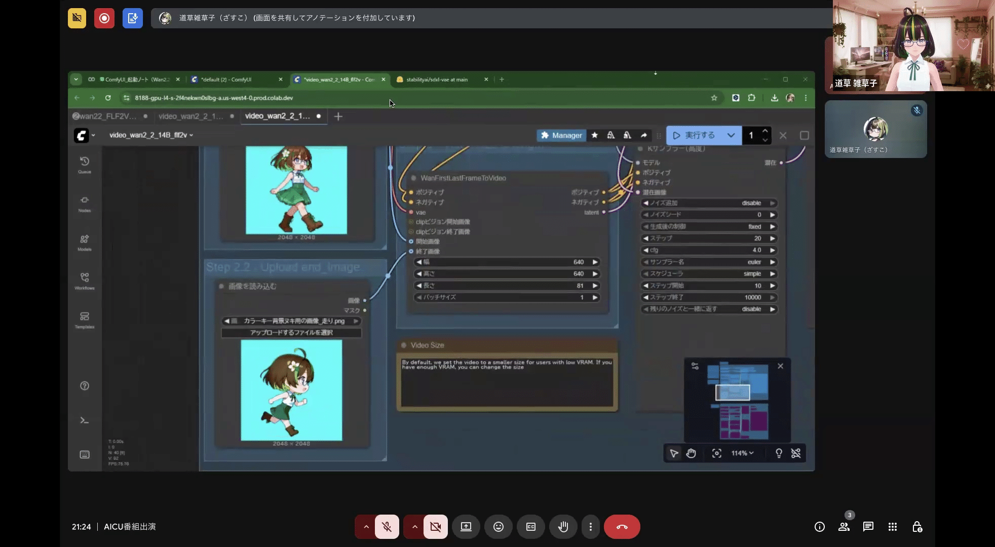 現在オープンソースの生成AIツール「ComfyUI」を使った動画生成を勉強する「ComfyJapan」として、毎週水曜日20時からオンライン勉強会を開催しています。ComfyUIの使い手である VTuber道草雑草子(ざすこ)さん X@zasuko_michiksa をお招きし、ゆるっとトークしながら、最新の使いこなしテクニックを共有しています。第1回まとめとして、ComfyUIを使った日本のユーザーならではの話題、LF2V(First-Last Frame to Video)と『Mellow Pencil』で作るめちゃかわいいループ動画の作り方などを共有しました。
