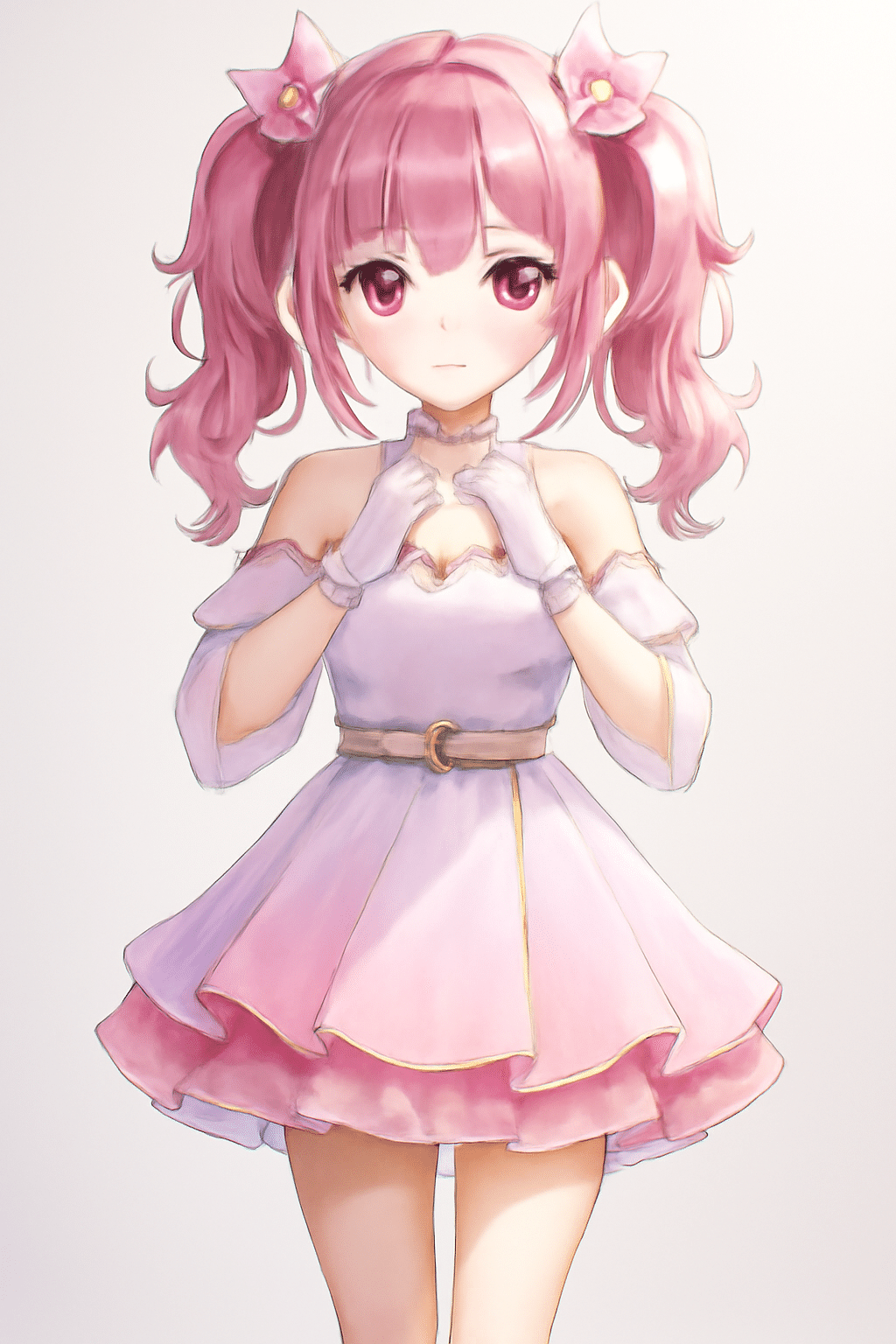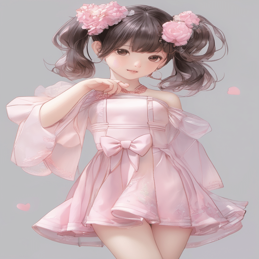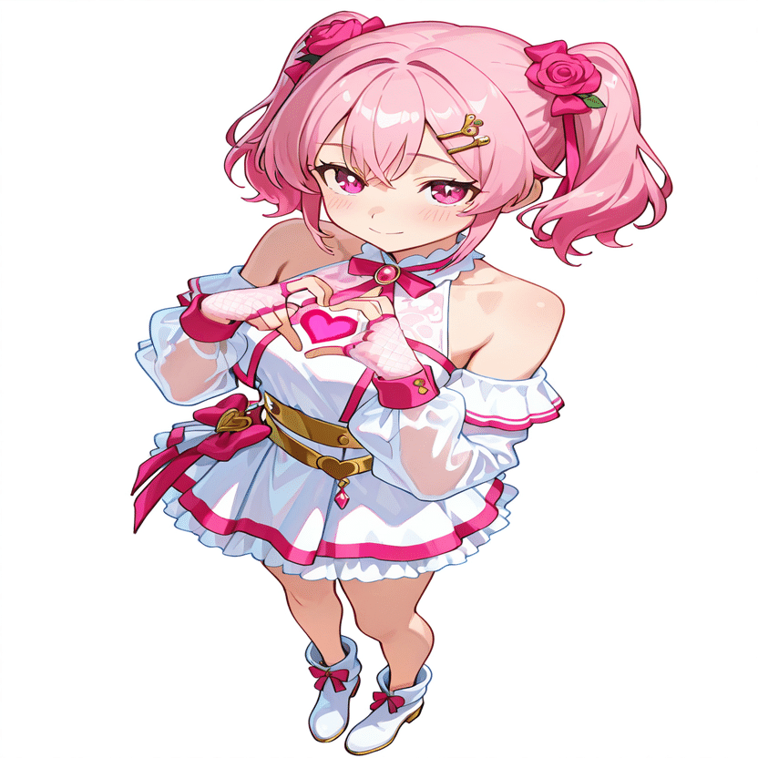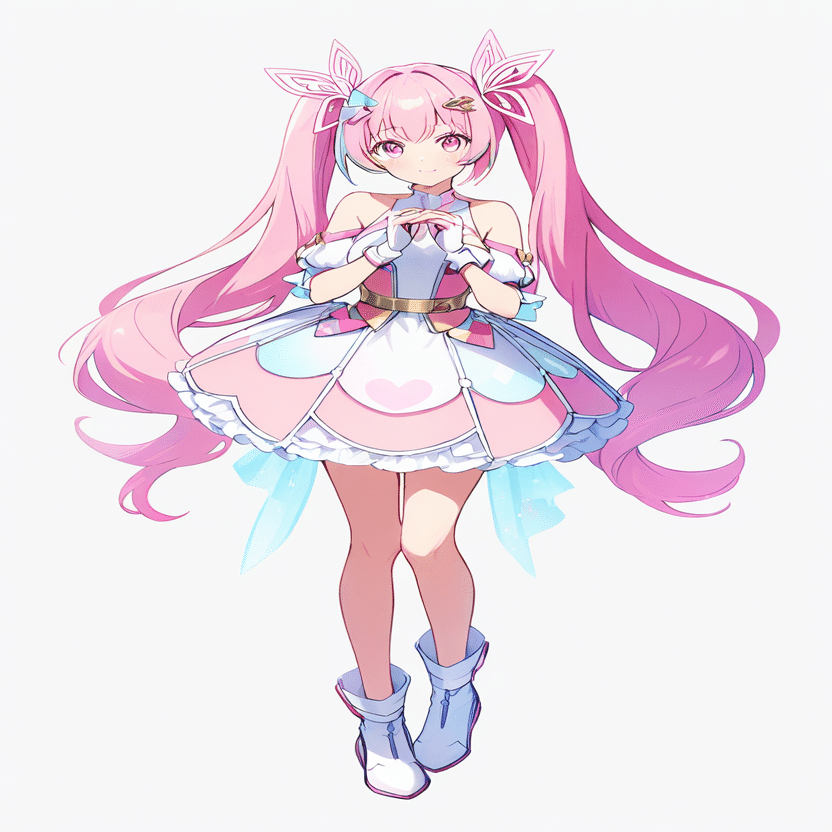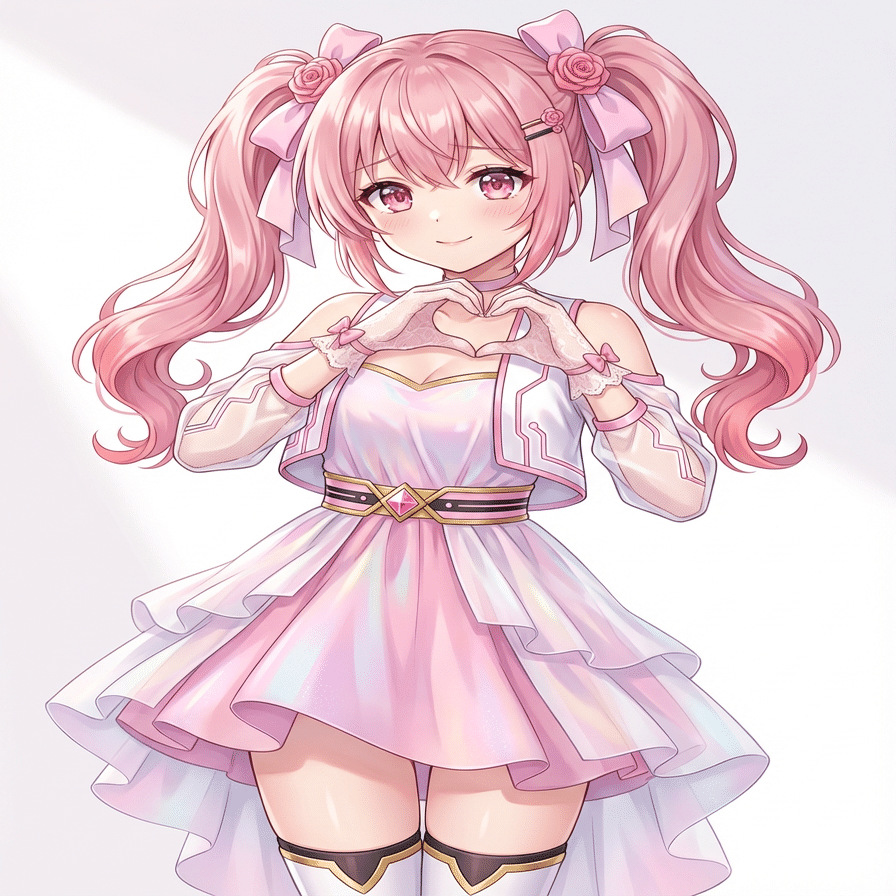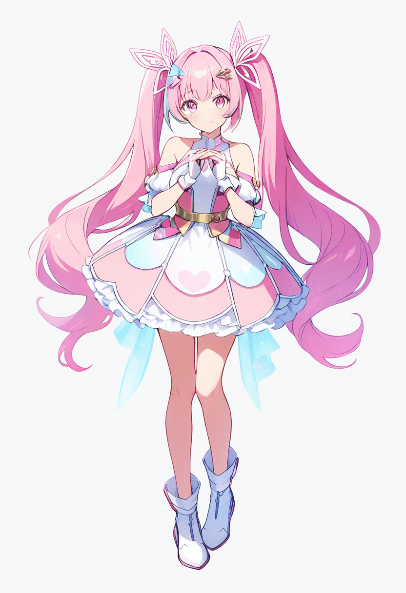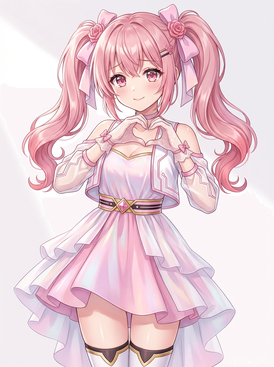 ポジティブプロンプトの要点:中心に立つ甘く優しいアニメアイドル、ピンクのツインテールと大きなリボン、輝くピンクの瞳。衣装は女神をイメージしたパステルピンクと白のドレスで、フューチャリスティックな光沢と繊細なゴールドのアクセントを加えています。背景は清潔感のあるスタジオの白背景、ライティングは左上からのソフトな指向性ライトに統一。