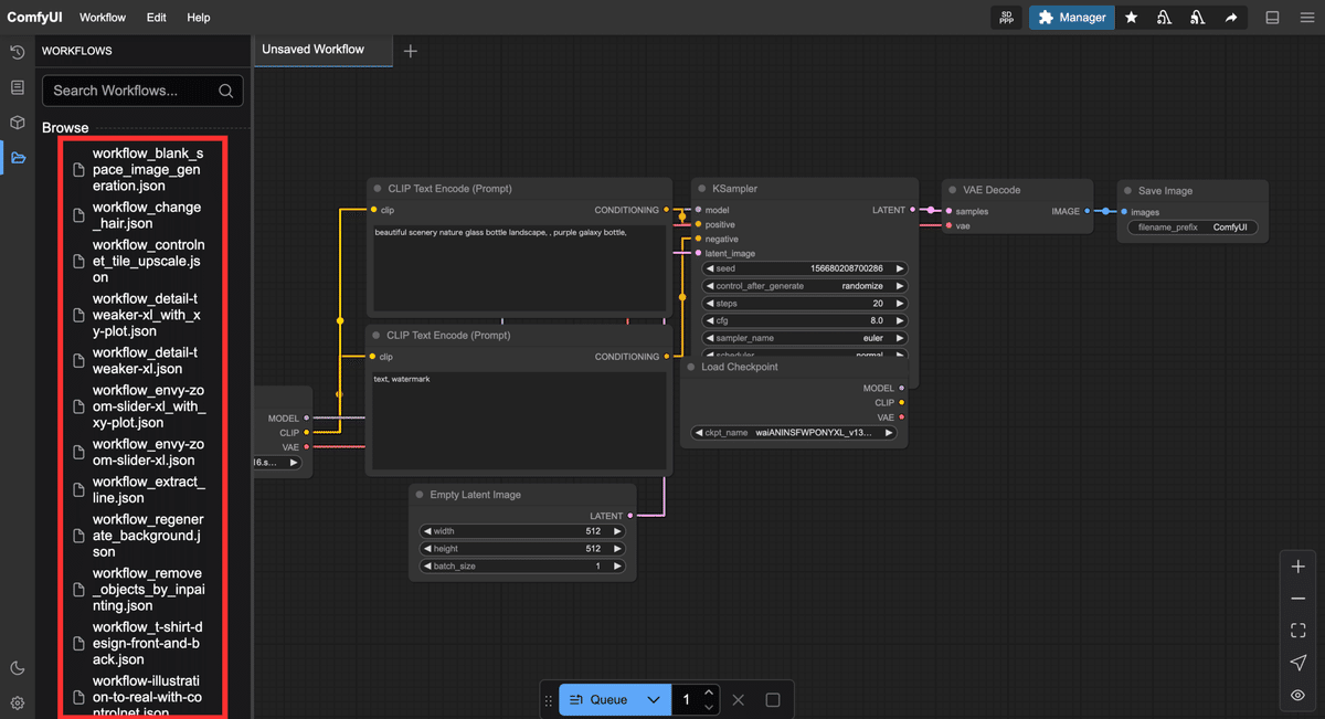 共有ComfyUIには、プリセットのモデルやワークフローを利用可能です。ここでは、モデルとワークフローを確認してみましょう。