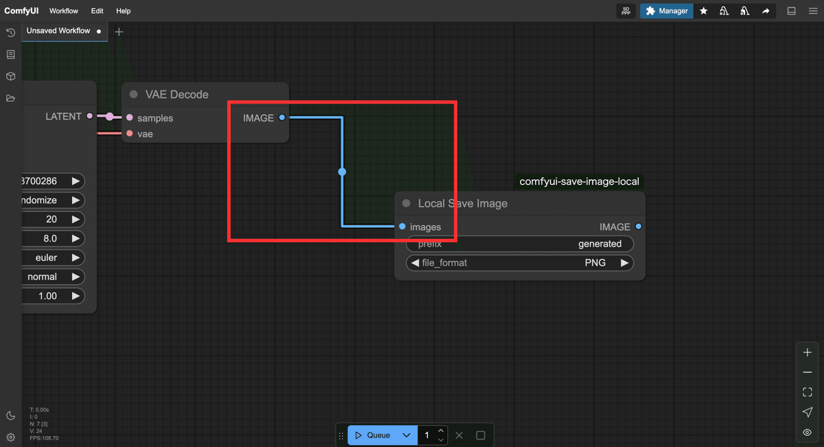 このノードを使うために、「VAE Decode」ノードの出力「IMAGE」を「Local Save Image」ノードの入力「images」に接続します。接続方法は、「VAE Decode」ノードの出力「IMAGE」上でドラッグ(左クリックを押し続ける状態)し、「Local Save Image」ノードの入力「images」上でドロップ(左クリックを話す)することで接続できます。これでローカルPCに画像を保存可能になります。