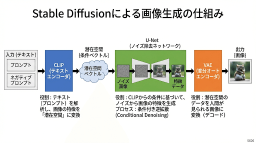 【画像・動画生成AI スタートガイド】第3回です。前回は生成AIの「種類」を俯瞰しました。今回は、いよいよその「中身」に踏み込みます。Stable Diffusionは、与えられたテキスト(プロンプト)から画像を生成しますが、その仕組みは「テキストを解析し、それが示す画像の特徴を有する「潜在空間」からノイズを除去して高解像度化する」というものです。「拡散モデル」「CLIP」「U-Net」「VAE」といった専門用語が飛び交う世界ですが、本節ではこれらを順を追って説明できるレベルまで理解していきましょう。