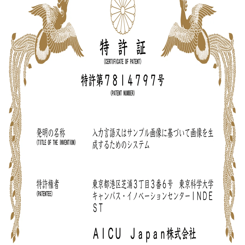 入力言語や参照画像に基づく報酬解決可能な画像生成システムに関する国際特許を日本で権利取得しています(特許第7814797号)。米国・中国・欧州でも審査が進められています。