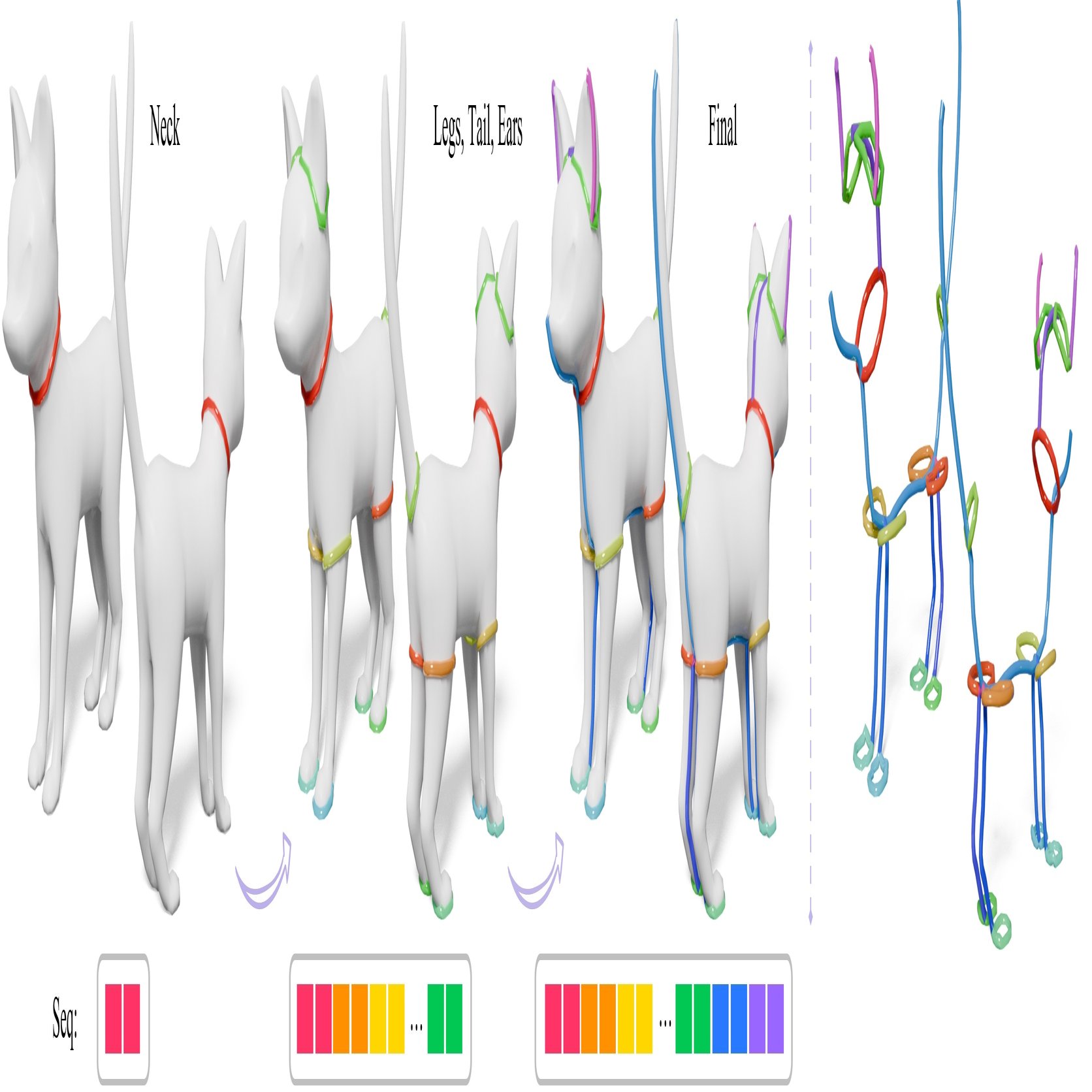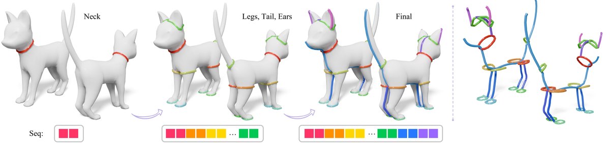 Figure 3: シームチェーンの標準的な順序付け(粗から密へ)。無秩序なシームセットを、自己回帰的な訓練/推論のための決定論的なシーケンスへとシリアル化します。戦略は「ループ優先、バランス優先、大パッチ優先」です。まずループカットを開いたチェーンよりも優先し、繰り返し「最大」の残存表面パッチを選択し、そのパッチ内で、結果として生じる2つのサブパッチ面積を最もよく「バランス」させるループカットを選択します(詳細は付録B.2を参照)。この例では、形状を分解するために主要なループカット(例:首の周り)が最初に配置され、続いてより小さなパーツ(足、尾、耳)のより細かなループが配置され、最終的な順序付けられたチェーンリストとトークンシーケンス $$\tau$$ が得られる様子を示しています。