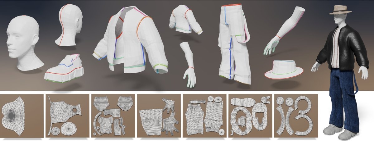 Figure 1: MeshTailor 上段: MeshTailorは3Dメッシュ上にシーム(色の付いた線)を直接生成し、形状の自然な構造を尊重した、クリーンでセマンティックに整列したカットを作成します。下段: 得られたシームは表面を一貫したUVチャートに分割し、これらは最小限の断片化で2Dレイアウトへと平坦化されます。右: これらの高品質なUVマップは、最終的なテクスチャ付きキャラクターモデルで示されているように、シームレスなテクスチャ適用を容易にします。