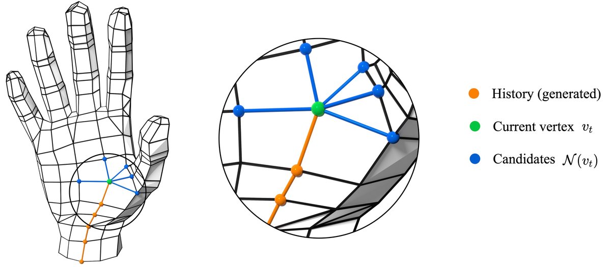 各ステップにおいて、モデルは現在の頂点の**1-ring近傍(直接隣接する頂点)**のみを選択肢として考慮します。