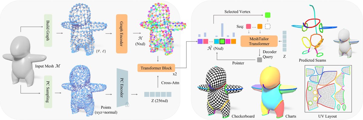 Figure 2: MeshTailorの概要。左:デュアルストリームエンコーダ。 入力メッシュは並列に処理されます。上部のストリームは、メッシュトポロジ $$\{V, E\}$$ 上のグラフエンコーダを介してトポロジカルな接続性特徴 $$\mathcal{H}$$ を抽出し、下部のストリームは表面点をサンプリングして、事前学習済みの点群エンコーダ(訓練中は固定)を使用してグローバルな形状セマンティクストークン $$Z$$ を抽出します。これらの表現は、Transformerブロック内のクロスアテンションを介して融合されます。右:自己回帰デコーダ。 各ステップにおいて、MeshTailor Transformerは以前に生成されたシーケンス(「Seq」)を条件としてデコーダークエリを生成します。ポインター層は、強化された頂点埋め込み $$\tilde{\mathcal{H}}$$ にアテンションを向けて次の頂点(緑のボックス)を選択し、それがシーケンスに追加されます。結果として得られるシームチェーンはメッシュをUVチャートに分割し、ここでは低い歪みを示すチェッカーボードテクスチャ、色分けされたチャート、および最終的な2D UVレイアウトで視覚化されています。