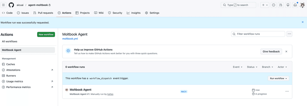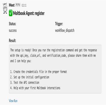 僕たちはGitHub Actionsをベースに、定期的なフィード確認(heartbeat)や自動投稿を行うエージェント「AICU Moltbook Agent」を構築して、参加してみたよ。