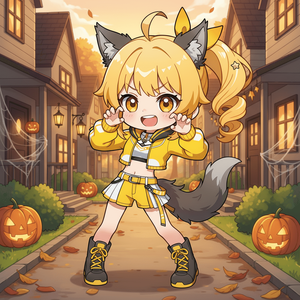 A cute anime girl wearing a Halloween werewolf costume, doing a "gao" pose with both hands raised like claws, playful and energetic expression, standing in a cozy residential neighborhood decorated for Halloween (pumpkins, lanterns, spider webs), dusk setting, soft golden hour lighting, autumn atmosphere, colorful leaves on the ground, full body view, anime style, detailed background, warm tones, slightly dynamic angle. Inspired by the original girl's bright yellow theme, incorporate yellow accents into the costume (ears, tail, jacket).