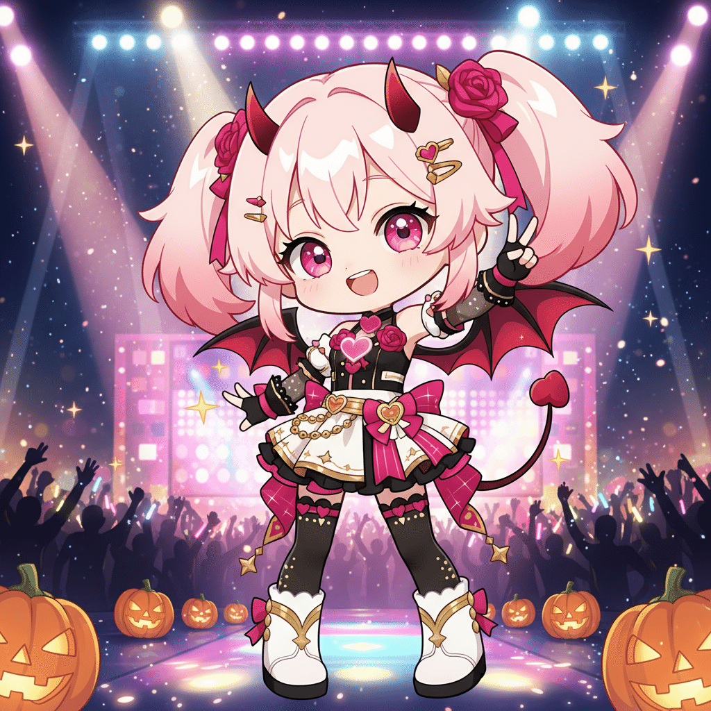 A cute pink-haired twin-tailed chibi idol character wearing a devil-themed Halloween costume, performing on a dazzling stage. Her outfit is a little devil style in black and red, with heart decorations, bat wings, small horns, and a tail. The background features glowing pumpkin lanterns, audience silhouettes, and shining stage lights. She is striking a lively pose, charming the audience. Cute and pop anime style, sparkling, dynamic, high-quality.