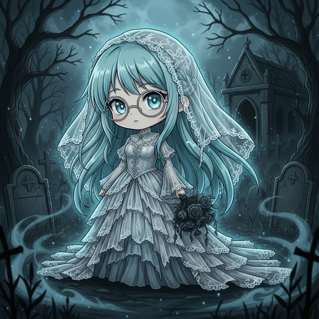 Chibi anime girl, turquoise long hair, glasses, dressed in a corpse bride style wedding gown, cute big head small body proportions, ghostly and tattered dress, holding a withered bouquet of dead roses, standing in a dark gothic graveyard at night, eerie atmosphere, ethereal blue glow, detailed lace veil, haunting yet adorable, cinematic lighting, gothic fantasy style, large sparkling chibi eyes.