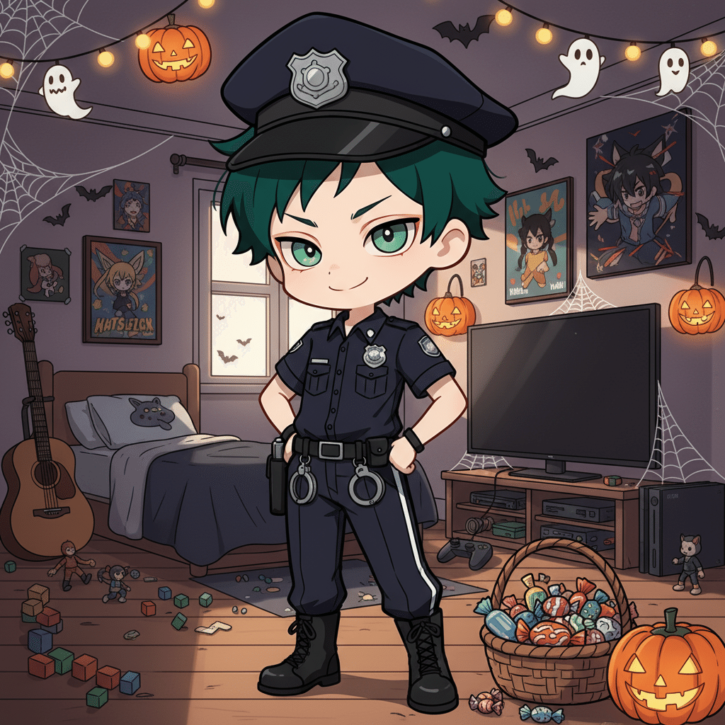 A chibi boy with green hair and big green eyes is standing in his room, wearing a Halloween police officer costume. He has a mischievous smile and is striking a playful pose. He is dressed in a black police uniform with a matching hat. The background is a boy's bedroom with items like a guitar, game consoles, posters, and scattered toys, giving the room a realistic, lived-in feeling. Halloween decorations such as pumpkin lanterns, spider webs, and warm orange lights are hung around the room. A basket of candy sits on the floor near him. The mood is cute, playful, and anime-style.