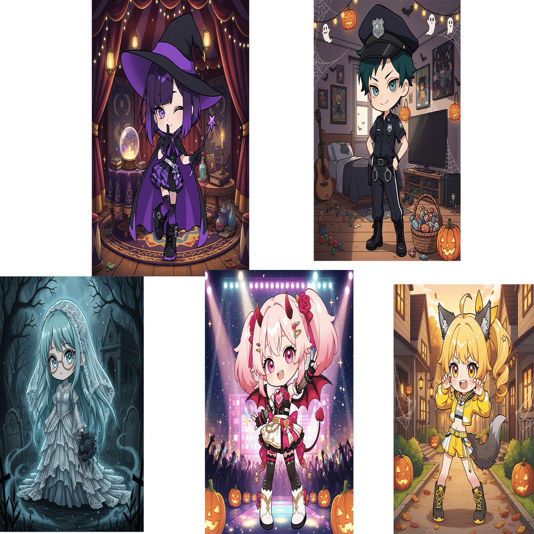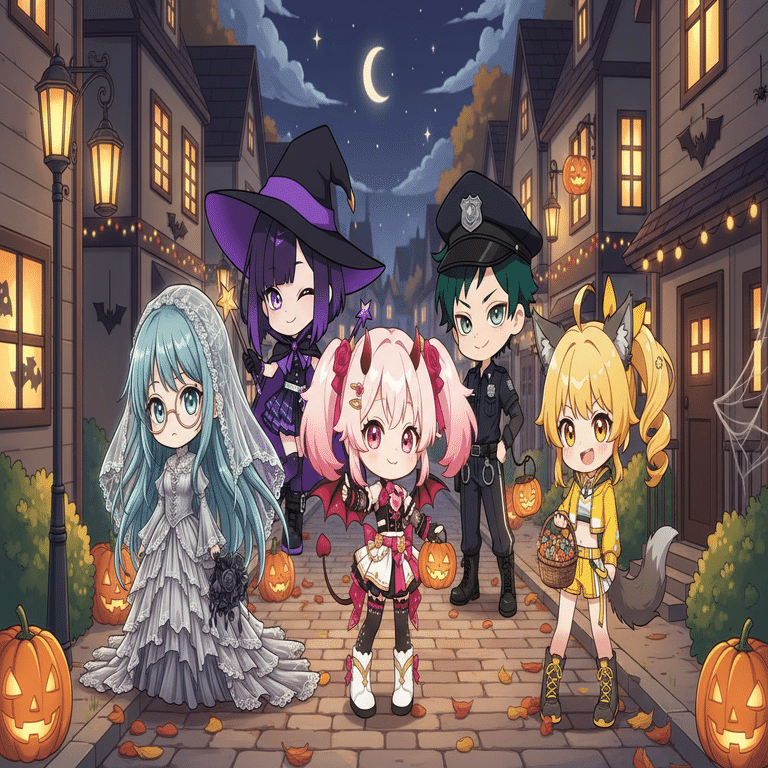 5 chibi characters posing together in a cozy halloween-themed residential street at night. 4 girls and 1 boy, each wearing unique pumpkin-themed halloween costumes: magical witch hats, pumpkin dresses, capes, small accessories like candy bags and glowing lanterns. Cute expressions: smiling, winking, shy, cheerful, mischievous. Warm lighting from street lamps and glowing pumpkin lanterns, colorful and detailed anime-style illustration, cozy night atmosphere, soft shading, balanced composition, adorable chibi style