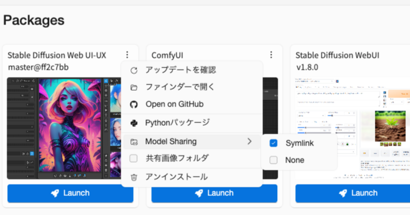Packageにインストールされたその他のパッケージの3点メニュー「…」から「アンインストール」、「アップデートを確認」や「共通画像フォルダ」の設定ができます。「Model Sharing」で「Symlink」にすると、モデルデータをリンクファイルとして共有できるのでディスクの容量を節約することができます。