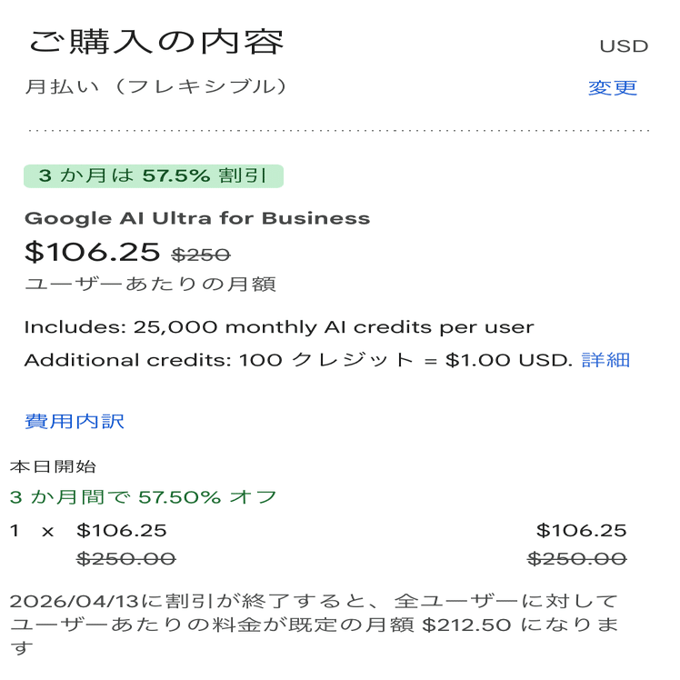 これは「Google AI Ultra for Business」での支払い画面で、Google Workspaceのユーザーに割り当てることができるようね。
