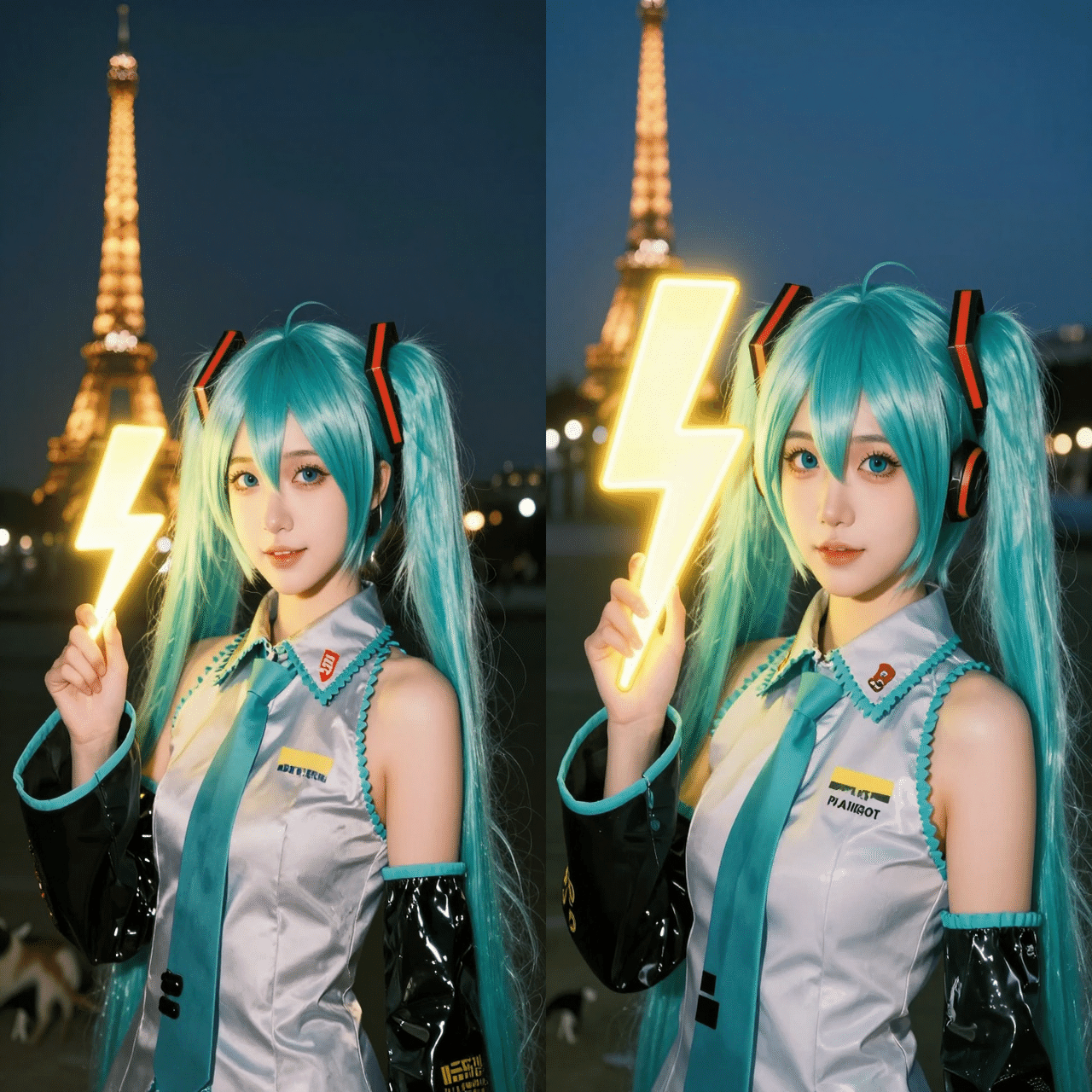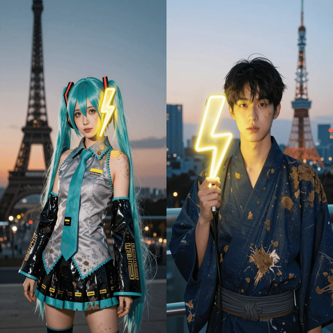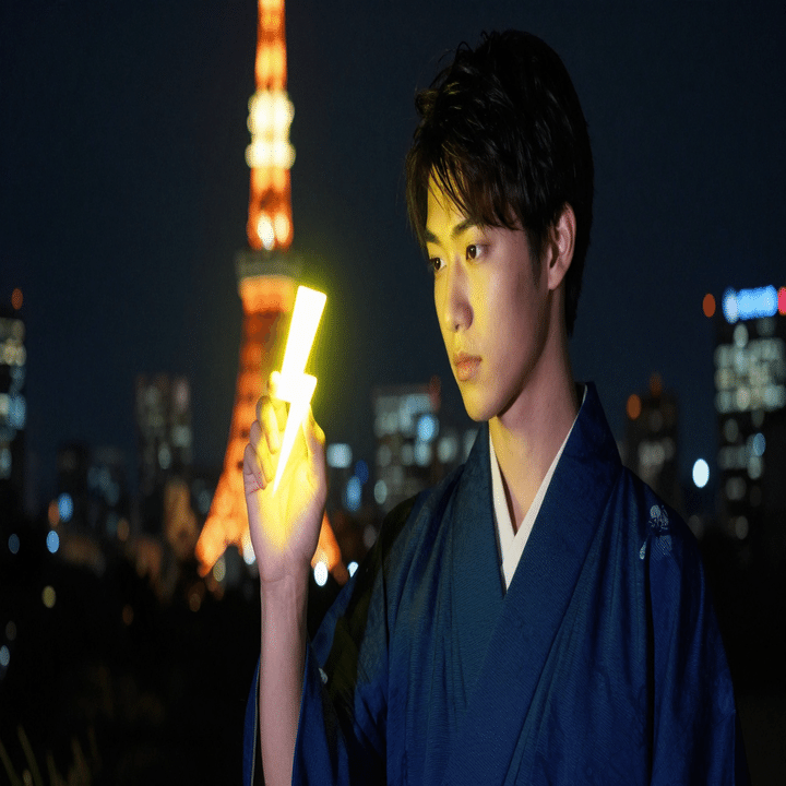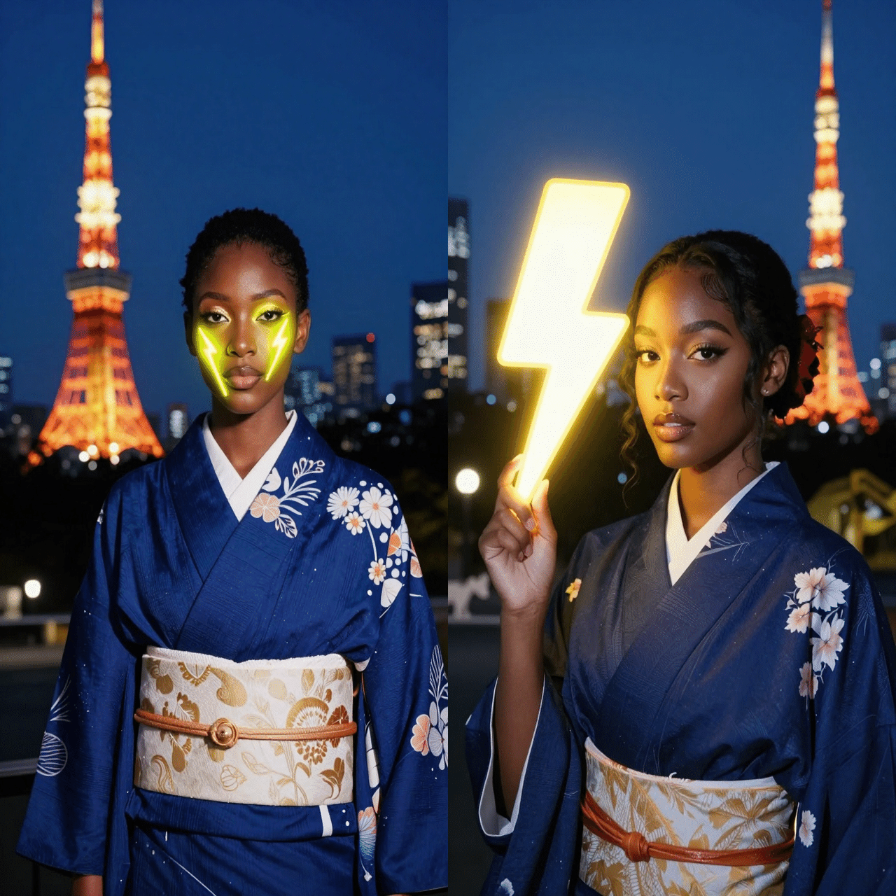 紺の和服を着た若く美しい日本の男性、完璧なメイク、顔の横にネオンの稲妻ランプ(⚡️)があり、明るい黄色の輝きを放っている。柔らかな照明の屋外の夜の背景、シルエットになった東京タワー、ぼやけた色とりどりの遠くの明かり。