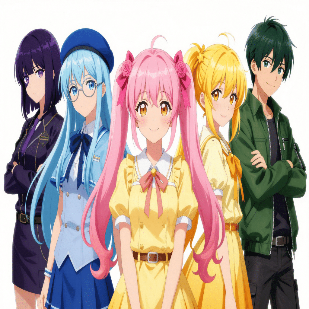 5 people, idol group lineup, full body, centered group composition, anime style, masterpiece, best quality,